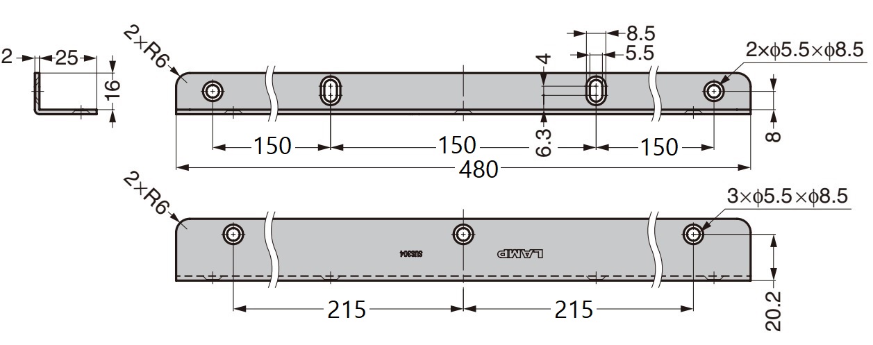 - SSA-480H-hyllykiinnikkeissä on seitsemän kiinnitysreikää, joiden halkaisija on ⌀5,5 mm (7/32″), upotuksella